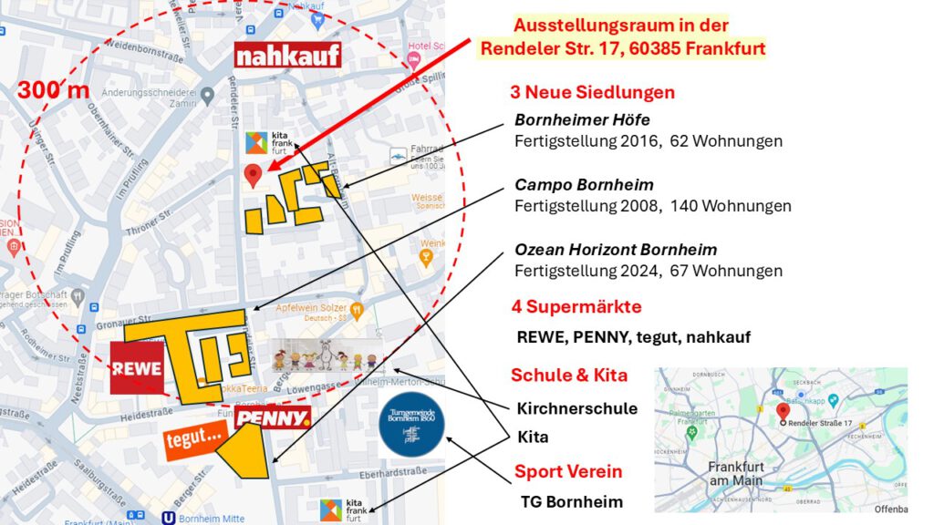 Unser Ausstellungsraum liegt im lebendigen Stadtteil Bornheim in Frankfurt am Main, nur wenige Schritte von der Berger Straße entfernt. Der Standort vereint Tradition mit einer jungen urbanen Bevölkerung und einem dynamisch wachsenden Wohnumfeld.